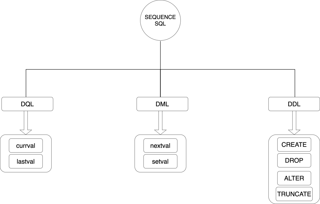 PostgreSQL 对 Sequence 对象也提供了类似于 表 的访问方式,即 DQL、DML 以及 DDL。我们从下图中可一览对外提供的 SQL 接口。