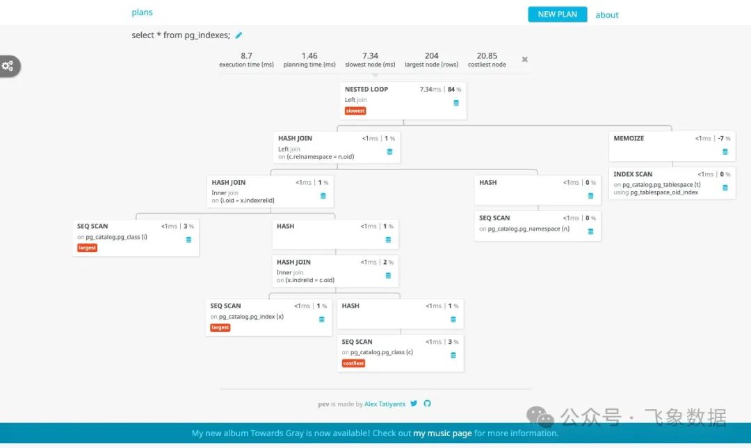 早在 2016 年,Alex Tatiyants 就创建了一个名为 PEV (Postgres Explain Visualizer) 的工具。Web 版本托管在 tatiyants.com/pev,但它也是免费和开源的。