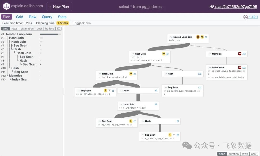 它将查询计划可视化为树(同时模仿 TEXT 格式结构),并在树上方添加一个图表(各种)以显示每个操作的时间分解。