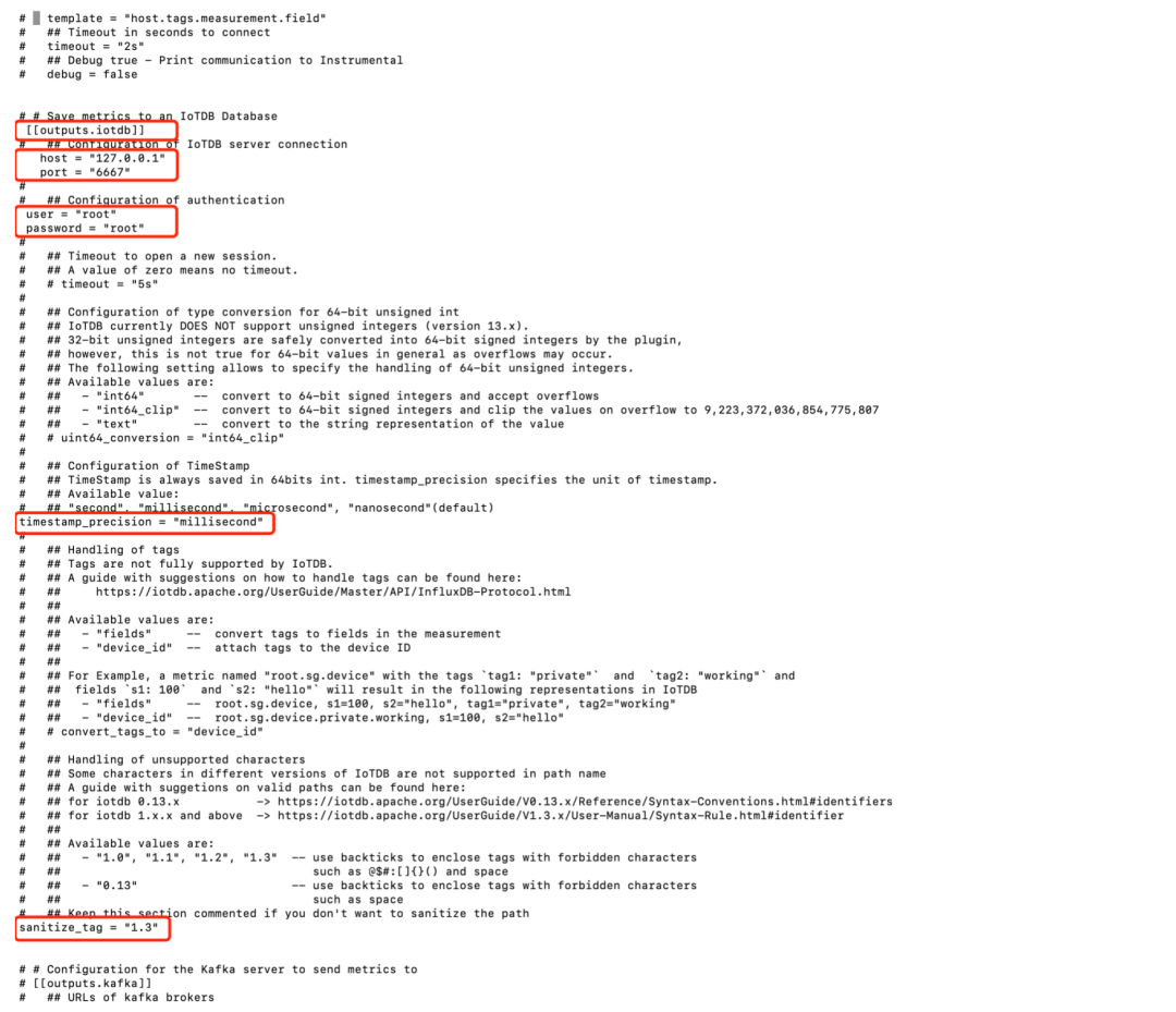 # Save metrics to an IoTDB Database[[outputs.iotdb]]## Configuration of IoTDB server connectionhost = "127.0.0.1"# port = "6667"## Configuration of authentication# user = "root"# password = "root"## Timeout to open a new session.## A value of zero means no timeout.# timeout = "5s"## Configuration of type conversion for 64-bit unsigned int## IoTDB currently DOES NOT support unsigned integers (version 13.x).## 32-bit unsigned integers are safely converted into 64-bit signed integers by the plugin,## however, this is not true for 64-bit values in general as overflows may occur.## The following setting allows to specify the handling of 64-bit unsigned integers.## Available values are:## - "int64" -- convert to 64-bit signed integers and accept overflows## - "int64_clip" -- convert to 64-bit signed integers and clip the values on overflow to 9,223,372,036,854,775,807## - "text" -- convert to the string representation of the value# uint64_conversion = "int64_clip"## Configuration of TimeStamp## TimeStamp is always saved in 64bits int. timestamp_precision specifies the unit of timestamp.## Available value:## "second", "millisecond", "microsecond", "nanosecond"(default)timestamp_precision = "millisecond"## Handling of tags## Tags are not fully supported by IoTDB.## A guide with suggestions on how to handle tags can be found here:## https://iotdb.apache.org/UserGuide/Master/API/InfluxDB-Protocol.html#### Available values are:## - "fields" -- convert tags to fields in the measurement## - "device_id" -- attach tags to the device ID#### For Example, a metric named "root.sg.device" with the tags `tag1: "private"` and `tag2: "working"` and## fields `s1: 100` and `s2: "hello"` will result in the following representations in IoTDB## - "fields" -- root.sg.device, s1=100, s2="hello", tag1="private", tag2="working"## - "device_id" -- root.sg.device.private.working, s1=100, s2="hello"# convert_tags_to = "device_id"## Handling of unsupported characters## Some characters in different versions of IoTDB are not supported in path name## A guide with suggetions on valid paths can be found here:## for iotdb 0.13.x -> https://iotdb.apache.org/UserGuide/V0.13.x/Reference/Syntax-Conventions.html#identifiers## for iotdb 1.x.x and above -> https://iotdb.apache.org/UserGuide/V1.3.x/User-Manual/Syntax-Rule.html#identifier#### Available values are:## - "1.0", "1.1", "1.2", "1.3" -- enclose in `` the world having forbidden character## such as @ $ # : [ ] { } ( ) space## - "0.13" -- enclose in `` the world having forbidden character## such as space#### Keep this section commented if you don't want to sanitize the pathsanitize_tag = "1.3"