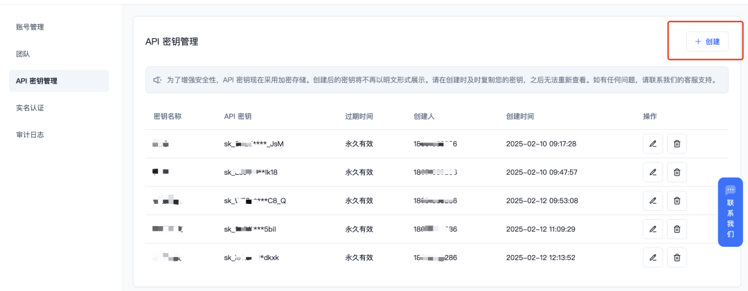 登录派欧云控制台 API 密钥管理页面,点击创建按钮。注册账号记得填写邀请码【VOJL20】。