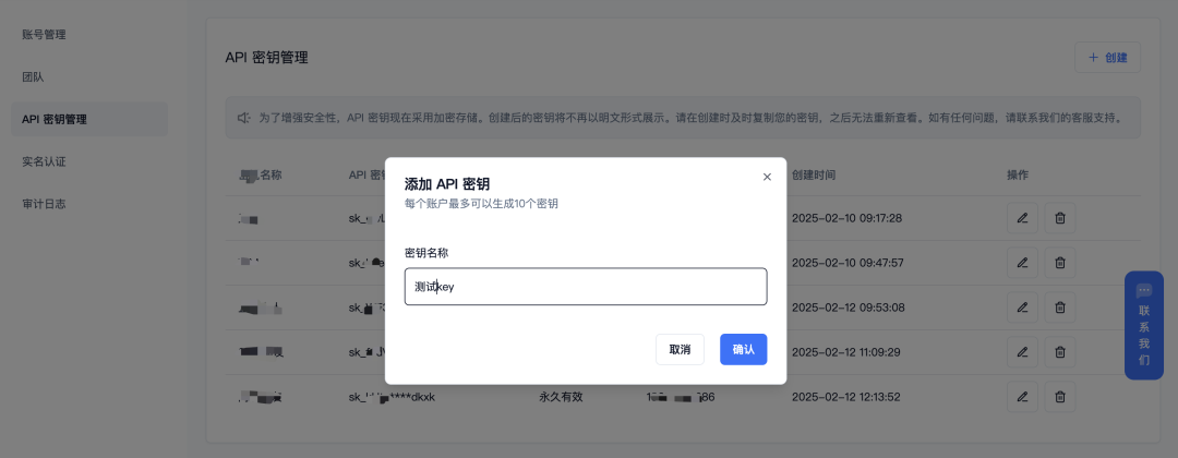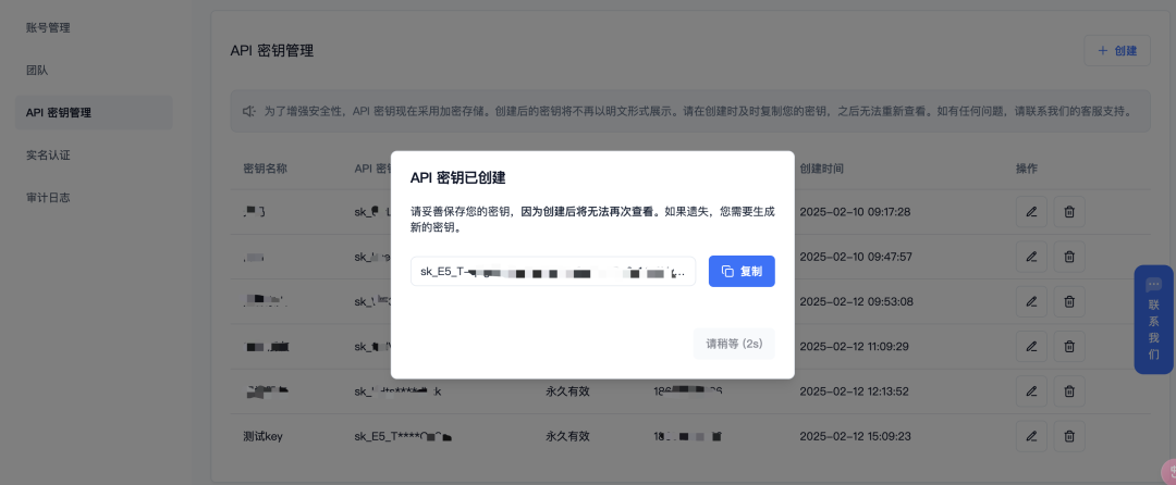 !!注意:密钥在服务端是加密存储,请在生成时保存好密钥;若遗失可以在控制台上删除并创建一个新的密钥。
