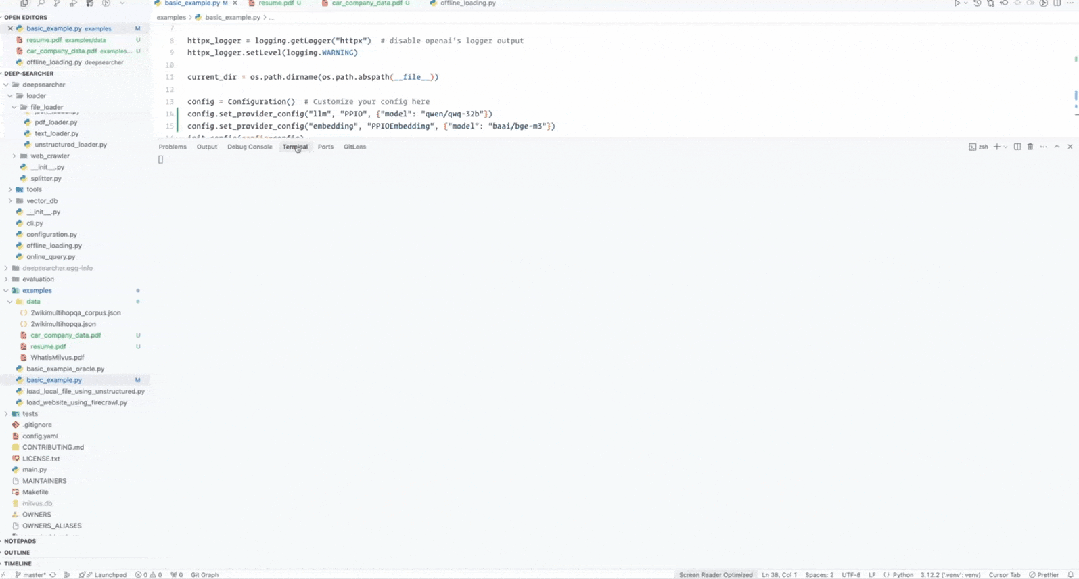 import loggingimport osfrom deepsearcher.offline_loading import load_from_local_filesfrom deepsearcher.online_query import queryfrom deepsearcher.configuration import Configuration, init_confighttpx_logger = logging.getLogger("httpx") # disable openai's logger outputhttpx_logger.setLevel(1ogging.WARNING)current_dir = os.path.dirname(os.path.abspath(__file__))config = Configuration() # Customize your config hereconfig.set_provider_config("llm","PPIO",{"model":"deepseek/deepseek-r1-turbo"})config.set_provider_config("embedding","PPIOEmbedding", {"model":"baai/bge-m3"})init_config(config=config)# You should clone the milvus docs repo to your local machine first, execute:# git clone https://github.com/milvus-io/milvus-docs.git# Then replace the path below with the path to the milvus-docs repo on your local machine# import glob# all_md_files = glob.glob('xx/milvus-docs/site/en/**/*.md',recursive=True)# load_from_local_files(paths_or_directory=all_md_files, collection_name="milvus_docs", collection_description="All Milvus Documents")# Hint: You can also load a single file, please execute it in the root directory of the deep searcher projectload_from_local_files(paths_or_directory=os.path.join(current_dir, "data/ducument_name.pdf"),collection_name="xxx",collection_description="xxx",force_new_collection=True, # If you want to drop origin collection and create a new collection every time,set force_new_collection to True)question="xxx"