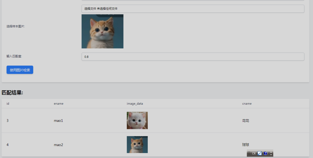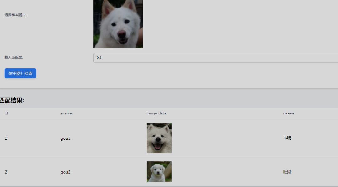库名、 表名、字段名(含图片的), 用来检索的图片文件,都选择好。点击使用图片检索,下方会显示出查询出的记录信息。