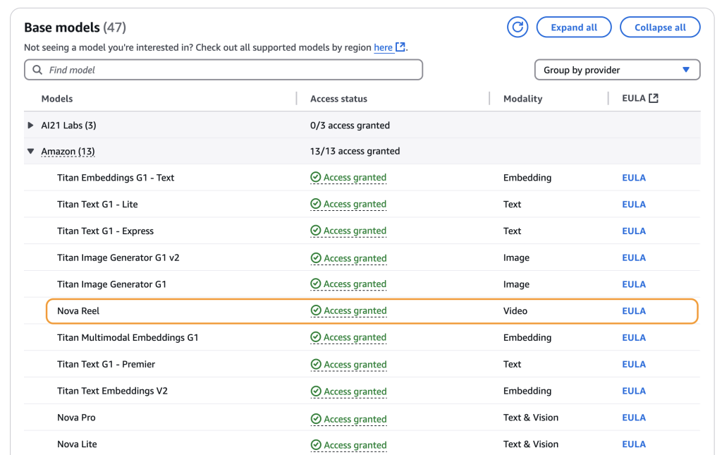 如果您是首次使用Amazon Nova Reel模型,请前往Amazon Bedrock控制台,在导航面板中选择“模型访问”,然后申请访问Amazon Nova Reel模型,该模型的访问权限将同时适用于Amazon Nova Reel 1.0和Amazon Nova Reel 1.1。