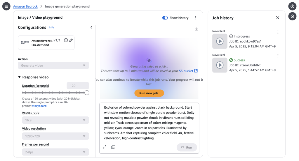 关于模式的注意事项:在自动模式下,您可输入的提示词长度最多为4000个字符。而在手动模式下,每个镜头可接受的提示语长度上限为512个字符,且单个视频中最多可包含20个镜头。建议您提前规划好镜头内容,这一过程类似于制作传统的分镜表。此外,输入的图像必须符合1280x720的分辨率要求。该服务会自动将生成的视频上传至您指定的Amazon S3存储桶。