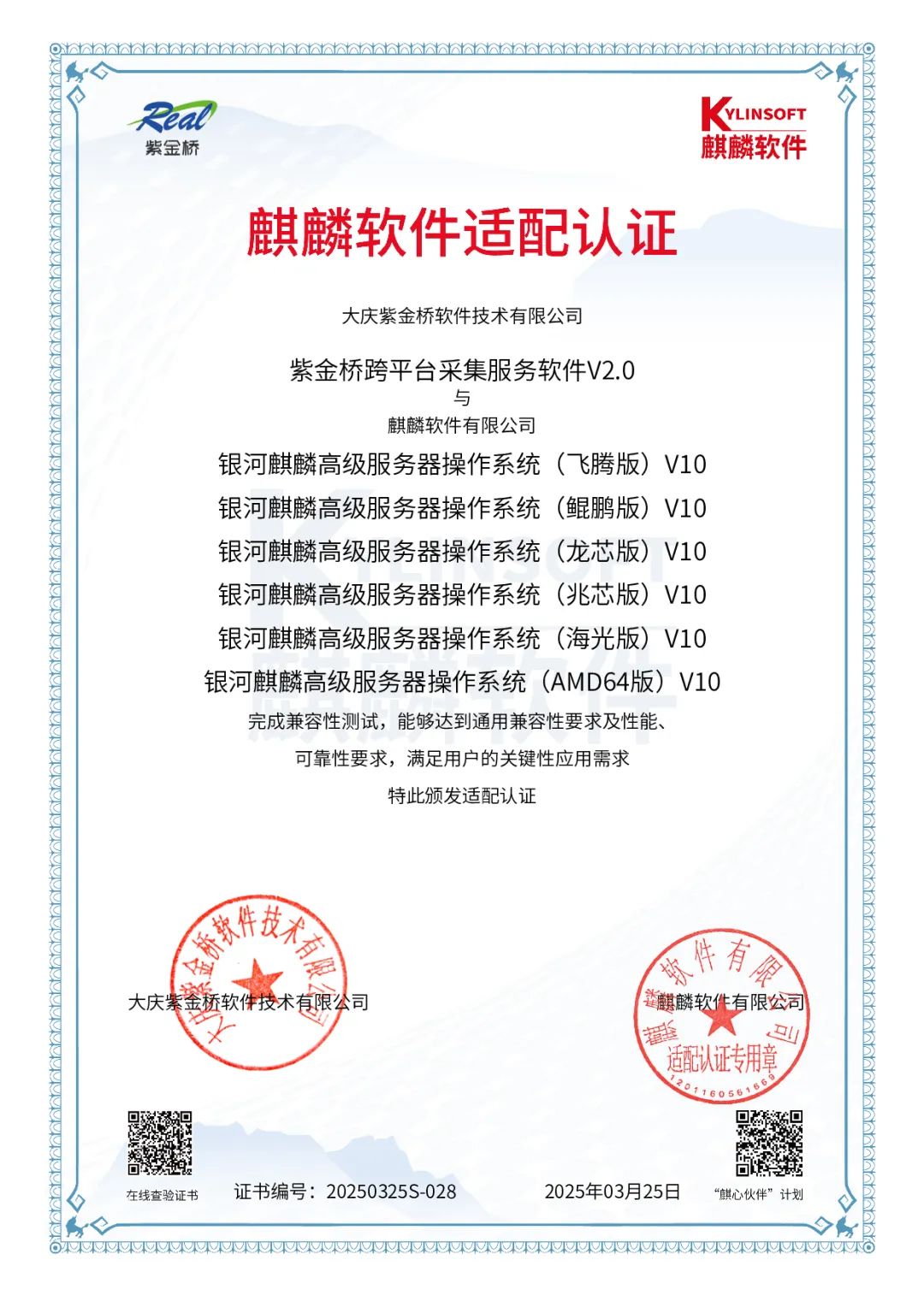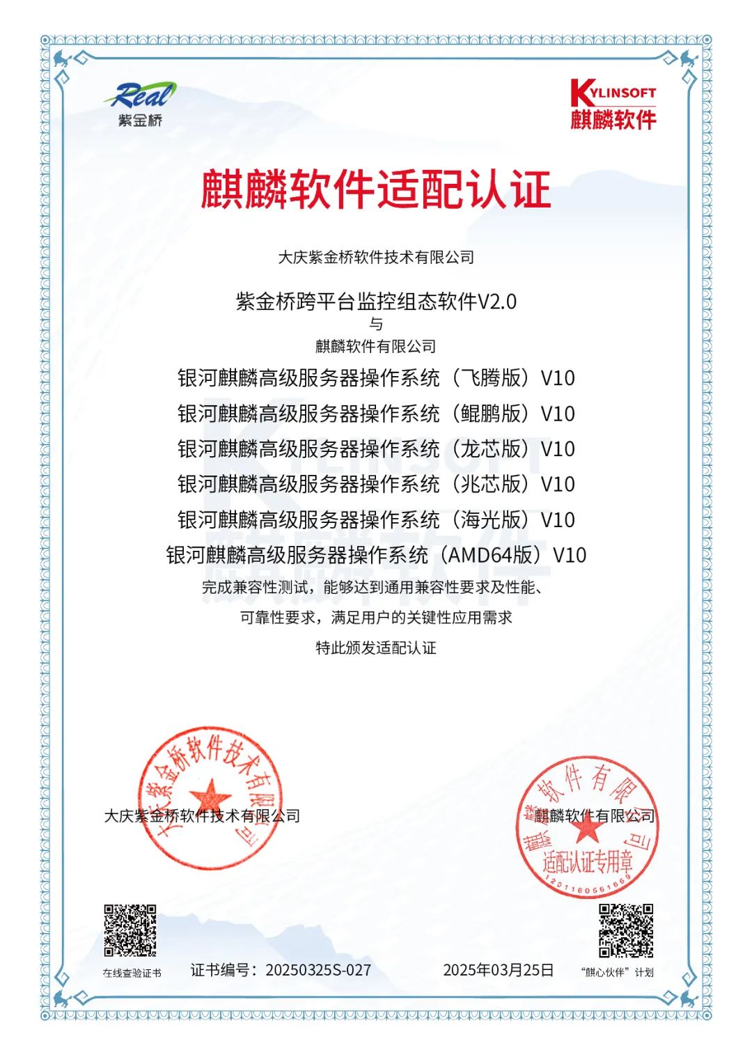 2025年3月,大庆紫金桥软件技术有限公司和银河麒麟软件有限公司,通过共同严格测试表明:紫金桥跨平台实时数据库 V3.2、紫金桥跨平台组态监控软件V2.0、紫金桥跨平台采集服务软件V2.0与银河麒麟服务器操作系统V10完成兼容性测试,能够达到通用兼容性要求及性能、可靠性要求,满足用户的关键性应用需求。