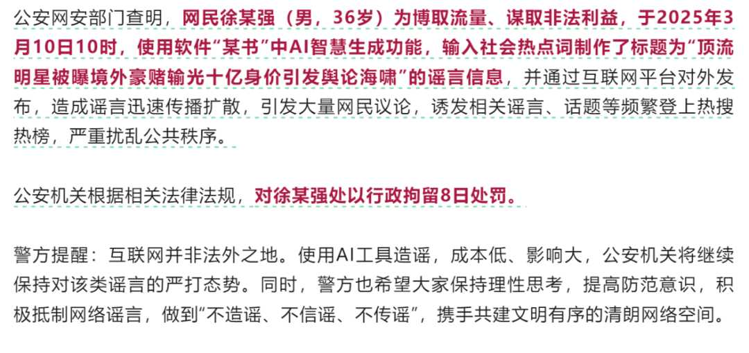 如最近疯传的“超一线明星在澳门输了10亿”的消息持续发酵,最后被证实是网民徐某强(男,36岁)为博取流量、谋取非法利益,使用软件“某书”中AI智慧生成功能,输入社会热点词制作了标题为“顶流明星被曝境外豪赌输光十亿身价引发舆论海啸”的谣言信息,最终被处以行政拘留8日的处罚。
