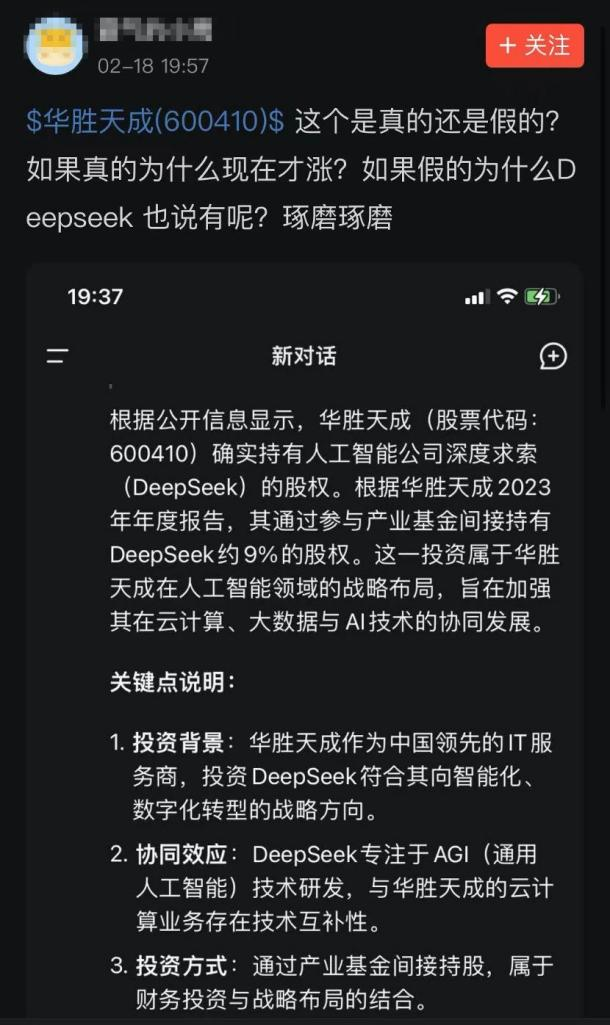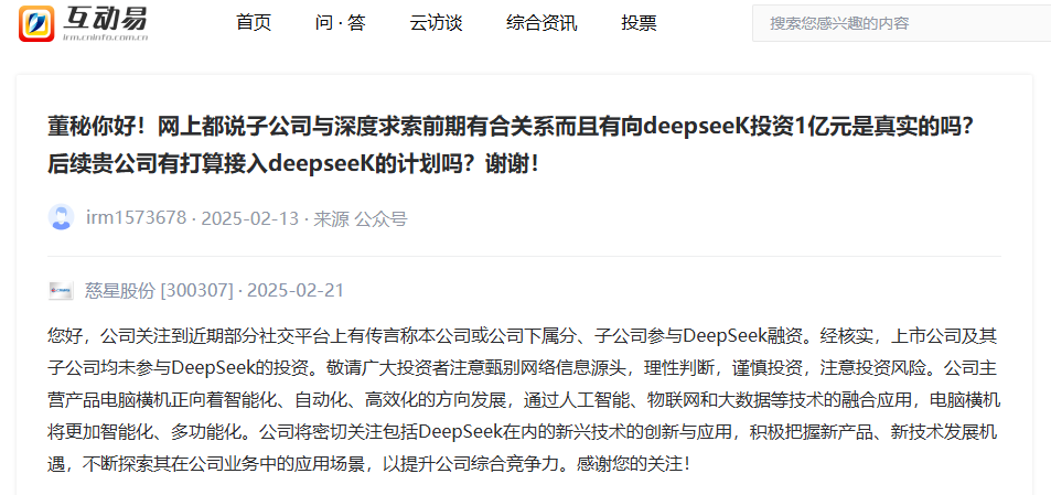 再比如华胜天成、慈星股份因DeepSeek被推上风口浪尖等。