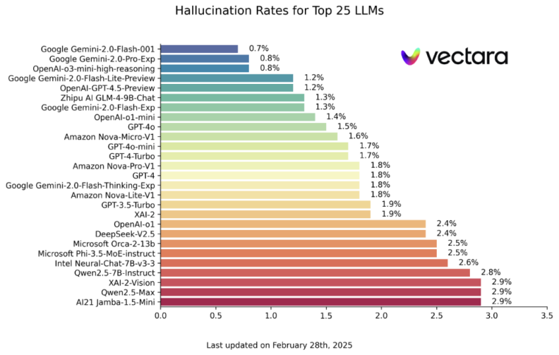 在现有技术水平下,AI幻觉比例其实非常高。来自Vectara机器学习团队的幻觉测试显示,截止到2025年2月28日,各主流AI大模型都或多或少存在AI幻觉问题。其中时下最火的