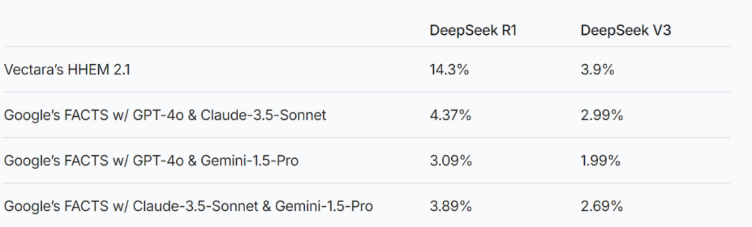 在Vectara机器学习团队的研究里,通过HHEM 2.1 来分析幻觉率,发现DeepSeek-R1 在幻觉率上比 DeepSeek-V3 高出了 大约 4 倍。
