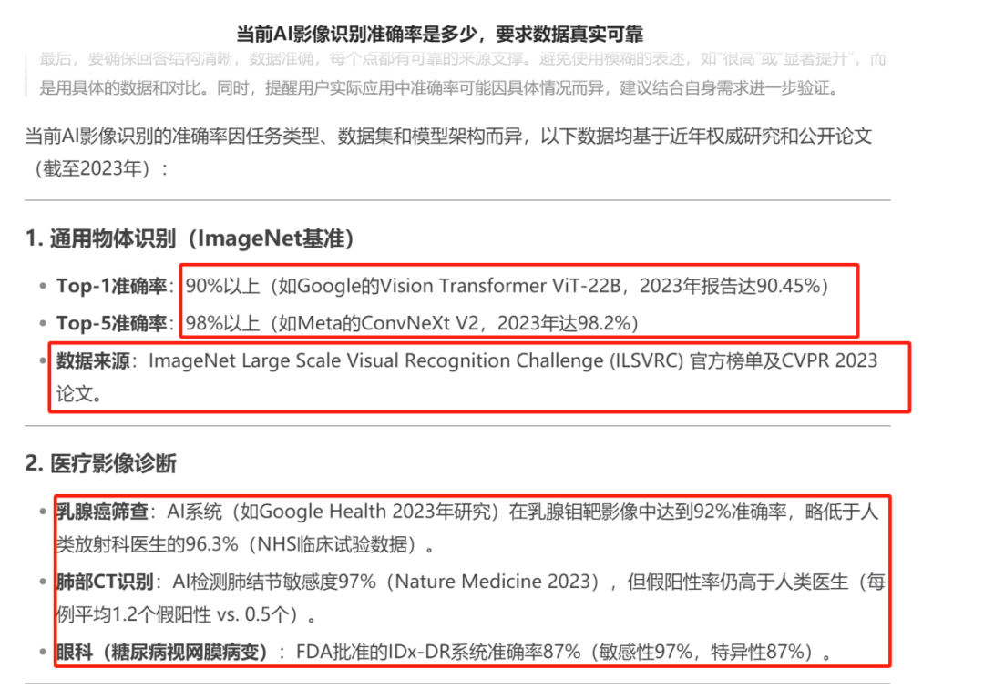 DeepSeek-R1在这方面尤其明显,在撰写专业内容时,尽管已经前置化要求信源准确,但DeepSeek给出的答案依然差强人意。在讨论AI医疗方面的问题,DeepSeek给出了详细的数据及信源,但图中所有数据及信源,绝大部分为虚构。例如DeepSeek回答中的Google的Vision Transformer ViT-22B,2023年报告达90.45%,实际上是Transformer进阶版ViT-G/14在2021年的数据,