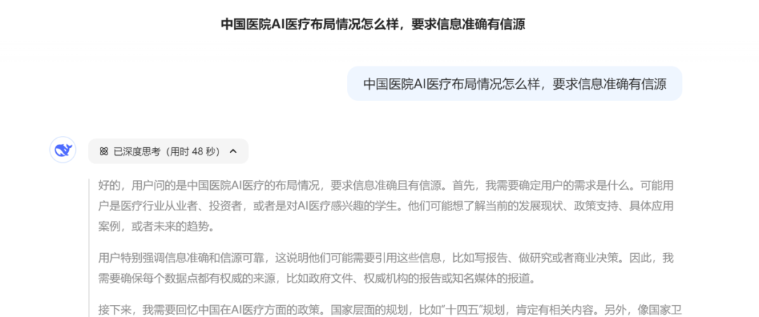 再比如,当询问DeepSeek中国医院AI医疗布局情况,DeepSeek给出的回答同样漏洞百出,经核查大部分为虚构信息。