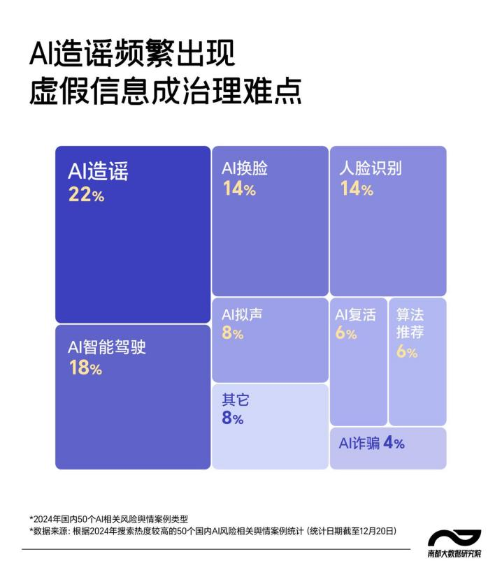 据南都大数据研究院发布的“AI新治向”专题报道,2024年搜索热度较高的50个国内AI风险相关舆情案例中,超1/5与AI造谣有关,AI谣言,已经成为社会公害。