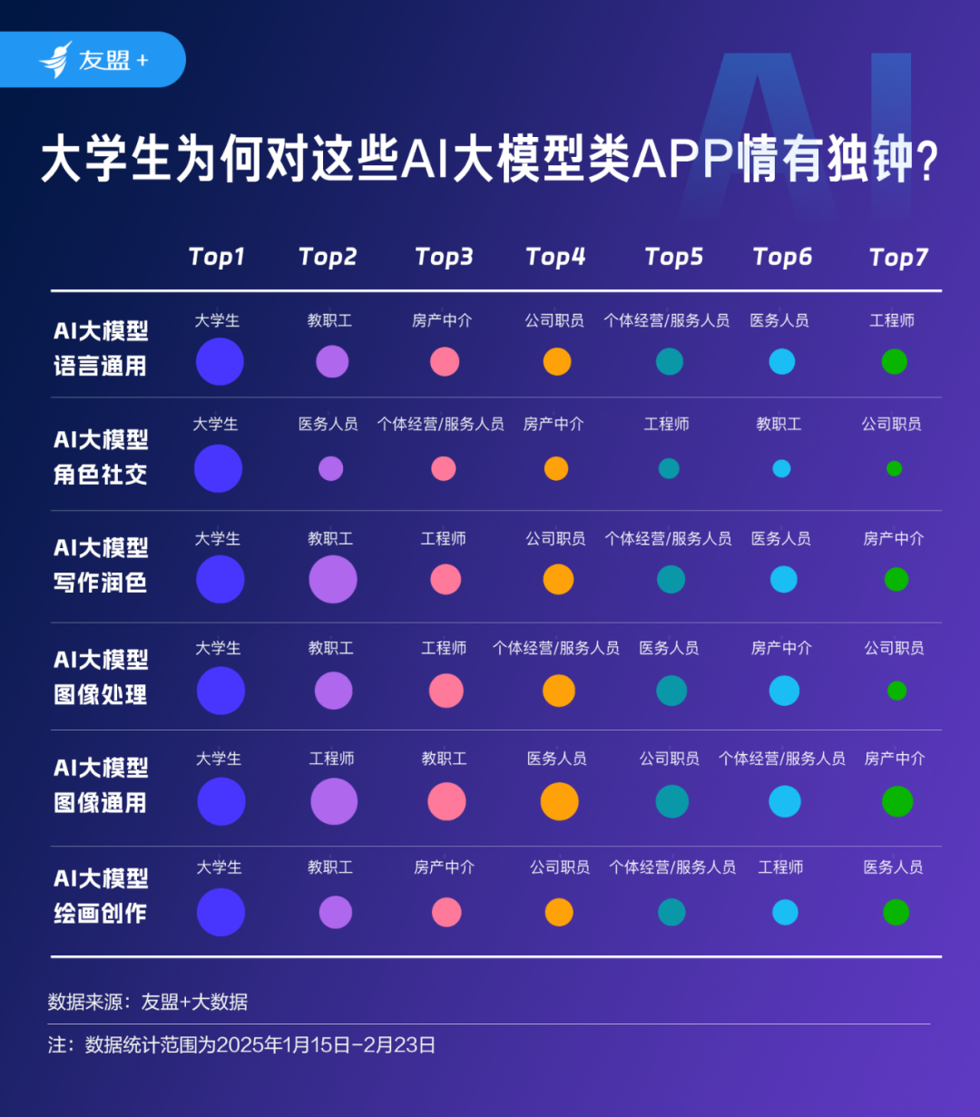 友盟+的最新数据将为这一问题提供答案。接下来,将从AI语言大模型、AI写作助手、AI角色社交和AI图像工具四个方面展开分析,揭示AI应用在大学生群体中的真实使用情况。