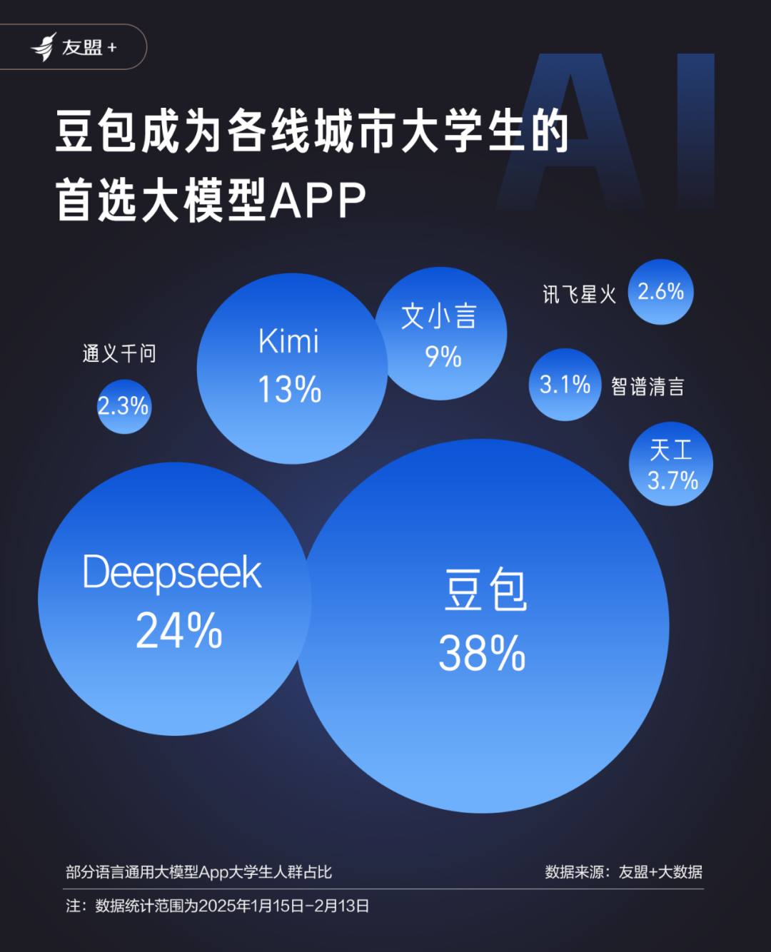 友盟+数据显示,豆包以38%的市场占比稳坐C位,成为大学生最爱的AI助手。Deepseek紧随其后,占比24%,Kimi则以13%排名第三。(当然,AI大模型市场瞬息万变,各大AI APP的