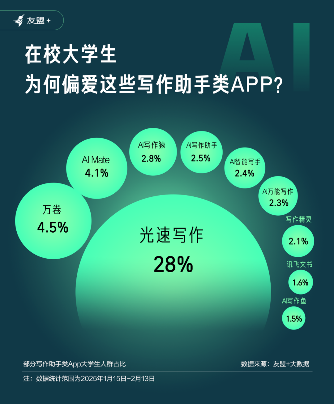 友盟+数据显示,光速写作以28%的占比稳居AI写作工具榜首,成为大学生最信赖的写作助手,远超其他竞品。