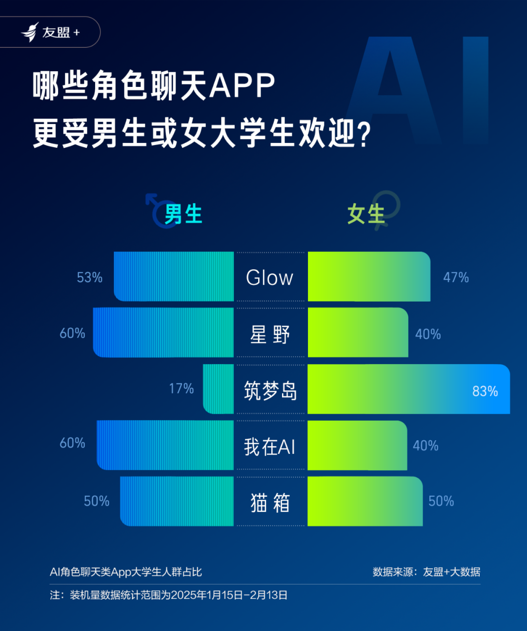 友盟+数据显示,不同性别的大学生在AI社交App上的偏好截然不同。男生更倾向于理性、互动性强的AI,而女生则更看重情绪陪伴和治愈感。男生偏爱“星野”(60%)和“我在AI”(60%)