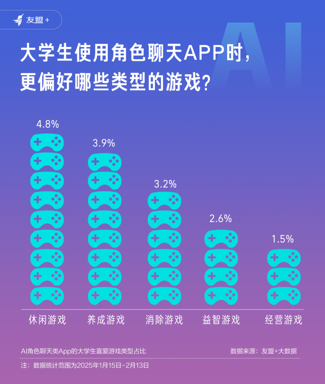 友盟+数据显示,偏爱AI社交的用户在游戏选择上,也更倾向于带有互动体验的轻松玩法。其中,休闲游戏占比4.8%,成为这类用户最喜爱的游戏类型,能够随时随地解压放松。养成类游戏紧随其后,占比3.9%,玩家可以通过培养和互动,建立更强的情感链接,就像“云养宠物”一样,投入感更强。而消除、益智类游戏(3.2%、2.
