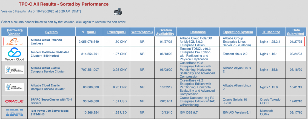 我们来设想这样一个场景:在一个宽敞的房间里,TPC-C基准测试的屏幕上,数字不停跳动,空气中弥漫着紧张而压迫的氛围。全球各大数据库厂商的成绩在不断更新,每一笔交易、每一秒的数据处理,都像是在高压下炸裂的火花。TPC-C——这项被誉为数据库领域“奥林匹克”的测试,要求参赛者在最严苛的环境中验证自己的极限表现。各家数据库系统在高并发、大规模数据处理的压力下拼尽全力,所有的调优、算法优化、硬件融合,甚至无数个通宵的奋斗,都是为了在榜单上取得一个好的名次。在这场没有硝烟的“战斗”中,不断产生新的数据库王者,阿里云的PolarDB,正在被更多人熟知。2月26日,在2025阿里云PolarDB开发者大会上,阿里云宣布PolarDB云原生数据库,以每分钟20.55亿笔交易(tpmC)和单位成本0.8元人民币(price/tpmC)的成绩,刷新TPC-C性能和性价比双榜的世界纪录。