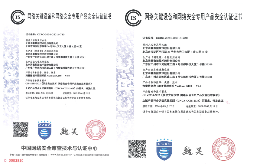 2. 网络关键设备和网络安全专用产品安全认证证书:Vastbase V2.2版本、V3.0版本均获得网络关键设备和网络安全专用产品安全认证证书。