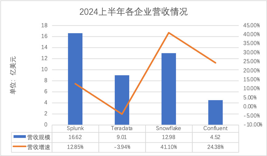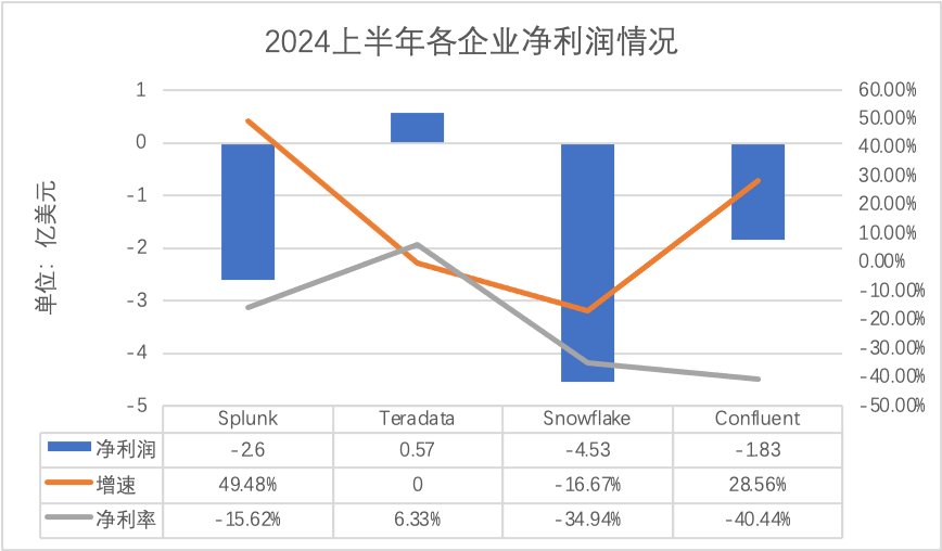 首先,基于2024财年上半年数据,我们看向已经上市的Splunk、Teradata、Snowflake、Confluent。从营收规模来看,Splunk、Teradata、Snowflake、Confluent分别实现16.62亿美元、9.01亿美元、12.98亿美元、4.52亿美元,增速分别为12.85%、-3.94%、41.1%、24.38%,可以看到Snowflake在营收规模和增速方面综合表现较为突出,具有很大的发展潜力;Splunk处于稳定增长状态且营收规模较大;Confluent虽然营收规模小但增速也保持了一个较好态势;Teradata则面临着营收负增长的挑战,需要调整业务策略来扭转局面。