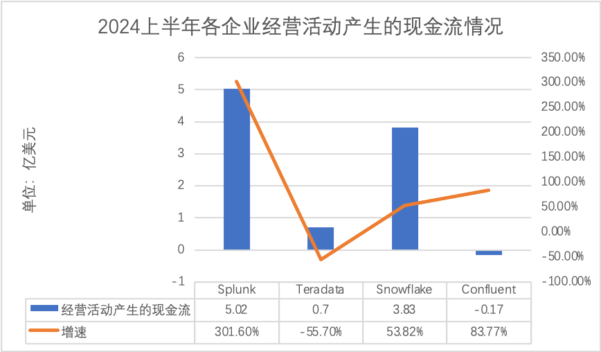 再看向经营活动产生的现金流,Splunk、Teradata、Snowflake、Confluent在期内分别为5.02 亿美元、0.7亿美元、3.83亿美元、-0.17亿美元,增速分别为301.60%、-55.7%、53.82%、83.77%。以上数据表明,Splunk在业务运营中现金流增长极为迅猛,可能是业务扩张或者成本控制有效的结果。Teradata则处于收缩状态,可能面临业务转型的挑战或者市场份额的流失。Snowflake也显示出了较为健康的现金流增长态势,Confluent则仍处于现金流出状态,可能处于投入大量资金用于业务拓展、研发或者市场推广的阶段。