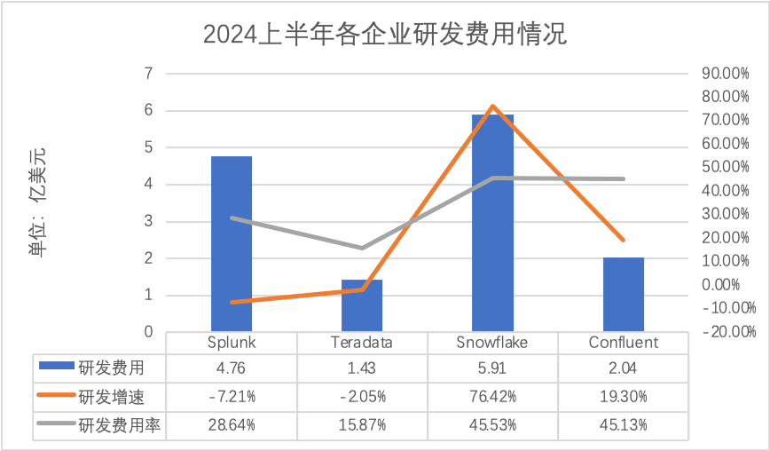 最后从研发费用数据来看,Splunk、Teradata、Snowflake、Confluent期内研发费用分别为4.76亿美元、1.43亿美元、5.91亿美元、2.04亿美元,增速分别为-7.21%、-2.05%、76.42%、19.30%,研发费用率分别为28.64%、15.87%、45.53%、45.13%。可见,在研发费用方面,Snowflake以5.91亿美元居首,Teradata则居末尾,为1.43亿美元。从增速来看,Snowflake呈现出高达76.42%的强劲增长,而Splunk和Teradata则出现负增长。研发费用率方面,Snowflake和Confluen均处于较高水平,Teradata则是15.87%相对较低。综合对比来看Snowflake在研发投入规模和增长速度上表现突出,而Teradata在研发投入规模和研发费用率方面相对保守。