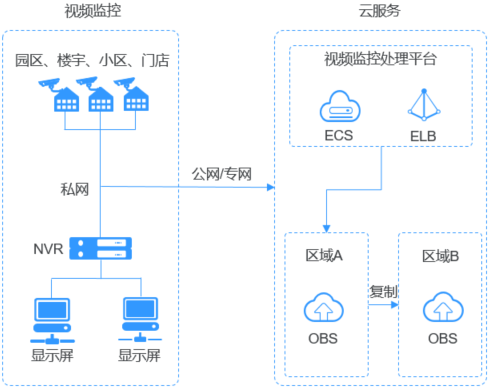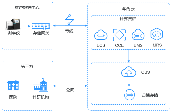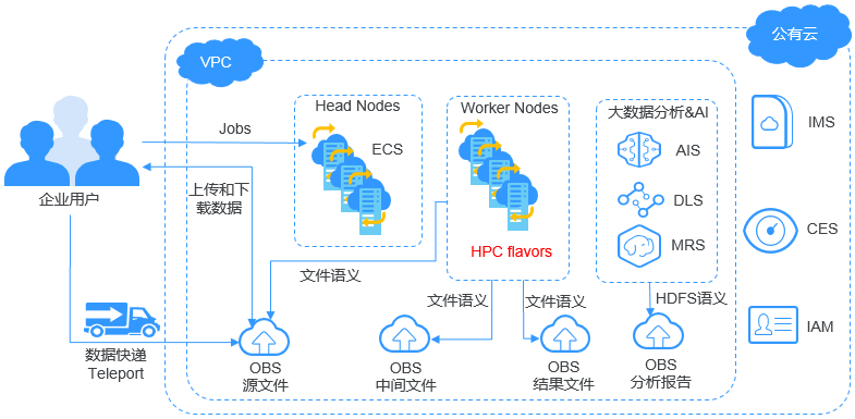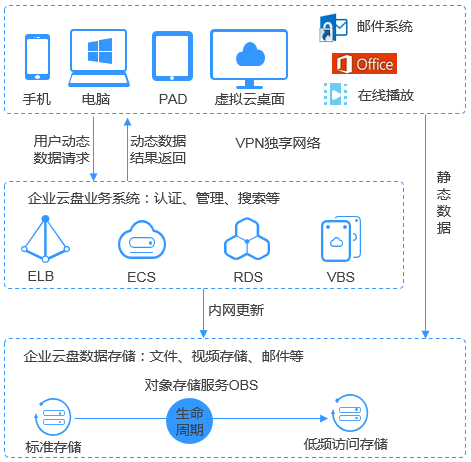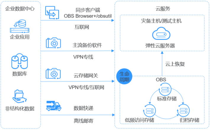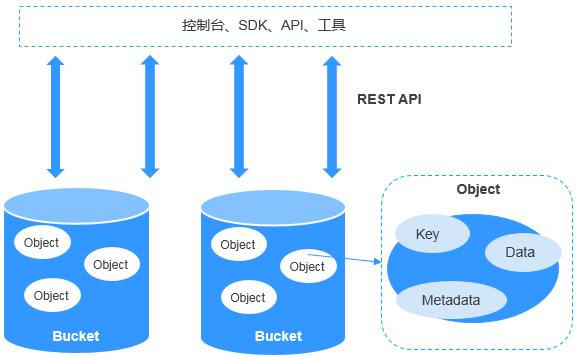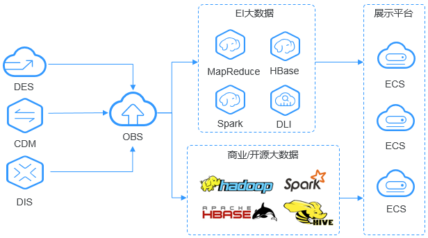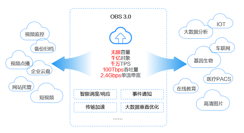 (Object Storage Service,OBS)对象存储服务(Object Storage Service,OBS)是一个基于对象的海量存储服务,为客户提供海量、安全、高可靠、低成本的数据存储能力。OBS系统和单个桶都没有总数据容量和对象/文件数量的限制,为用户提供了超大存储容量的能力,适合存放任意类型的文件,适合普通用户、网站、企业和开发者使用。OBS是一项面向Internet访问的服务,提供了基于HTTP/HTTPS协议的Web服务接口,用户可以随时随地连接到Internet,通过OBS管理控制台或各种OBS工具访问和管理存储在OBS中的数据。如上所示,对象存储的产品架构图,对象存储是大数据领域使用云计算平台技术(OpenStack S3)提供大规模数据量的文件存储服务的技术,具备高可用性以及高可扩展性的系统特性,在应用层,对象存储平台提供文件管理控制台、在控制台中管理文件,提供前端应用接入服务的SDK、前端应用集成SDK调用后端存储服务,提供开放接口服务API、前端应用直接使用API调用后端存储服务,提供其他的文件系统管理工具。在文件存储层,对象是存储在Bucket中,Bucket是一种高效的存储技术,对象支持备份、复制以及恢复,每个对象的属性包括key-value键值对、key唯一标识集群内的对象、value包括对象的描述元数据信息以及文件的实际数据如上所示,华为云对象存储服务OBS在文件数据的高可用性以及高可靠性方面,提供的级别包括区域可靠性、数据中心可靠性、机柜可靠性、服务器可靠性、介质可靠性,每个对象使用复制备份的冗余策略,多个副本分布在不同的区域中存储,当其中一个副本失效,则从其他可用区域的副本中恢复如上所示,华为云对象存储服务OBS支持标准REST API、多版本SDK和数据迁移工具,让业务快速上云。无需事先规划存储容量,存储资源和性能可线性无限扩展,不用担心存储资源扩容、缩容问题。OBS支持在线升级、在线扩容,升级扩容由华为云实施,客户无感知。同时提供全新的POSIX语言系统,应用接入更简便如上所示,大数据分析应用架构中,分析流程包括三个阶段,从DES或者其他数据源中同步大规模的数据量到OBS中存储,MR、Spark或者其他大数据分析引擎从OBS中拉取数据执行数据分析,将数据分析的结果呈现在ECS的应用平台上如上所示,web应用架构中,终端用户访问后端业务应用系统的静态资源或者动态资源,这些资源是存储在OBS中,静态资源使用CDN技术同步到距离终端用户较近的服务器节点中,供终端用户实现高速访问,动态资源在后端业务系统中使用动态解析的技术,即时生成终端用户需要的数据,这些数据是在内网中根据业务需求动态地更新、封装,作为整体返回给终端用户使用如上所示,在线视频播放应用架构中,视频处理的业务流程的阶段包括,视频录制端上传视频内容到OBS中存储,由云服务的多媒体后端业务系统对原始视频内容执行加工处理,生成流媒体,由CDN同步到分布在不同地域的数据中心,不同地域的应用客户端读取CDN的流媒体内容执行高速视频播放如上所示,大数据分析应用架构中,OBS提供高并发、高可靠、低时延、低成本的海量存储系统,结合计算服务可快速搭建高扩展性、低成本、高可用的基因测序平台。客户数据中心测序仪上的数据通过云专线自动快速上传到华为云,通过由ECS、CCE、MRS等服务搭建的计算集群进行分析计算,分析计算产生的数据和计算结果存储到OBS中,其中上传到华为云的基因数据自动转为低成本的归档存储对象保存在OBS提供的归档存储中,计算得出的测序结果通过公网在线分发到医院和科研机构如上所示,云边端应用架构中,终端侧的NVR录像机在本地执行视频录制,边缘端的计算服务系统执行实时智能分析,同时,NVR录像机同步视频内容到云服务端的OBS中存储,远程应用客户端读取OBS中的视频内容,实时在线查看终端侧的视频内容如上所示,数据库应用架构中,企业数据中心的各类数据通过使用同步客户端(如OBS Browser+、obsutil)、主流备份软件、云存储网关或数据快递服务DES,备份至对象存储服务OBS。OBS提供生命周期功能实现对象存储类别自动转换,以降低存储成本。在需要时,可将OBS中的数据恢复到云上的灾备主机或测试主机(High Performance Compute)如上所示,在HPC场景下,企业用户的数据可以通过直接上传或数据快递的方式上传到OBS。同时OBS提供的文件语义和HDFS语义支持将OBS直接挂载到HPC flavors的节点以及大数据&AI分析的应用下,为高性能计算各个环节提供便捷高效的数据读写和存储能力如上所示,网络硬盘的应用架构中,用户手机、电脑、PAD等终端设备上的动态数据与搭建在华为云上的企业云盘业务系统进行交互,动态数据请求发送到企业云盘业务系统处理后直接返回给终端设备。静态数据保存在OBS中,业务系统通过内网对静态数据进行处理,用户终端直接向OBS请求和恢复静态数据。同时,OBS提供生命周期功能,实现不同对象存储类别之间的自动转换,以节省存储成本