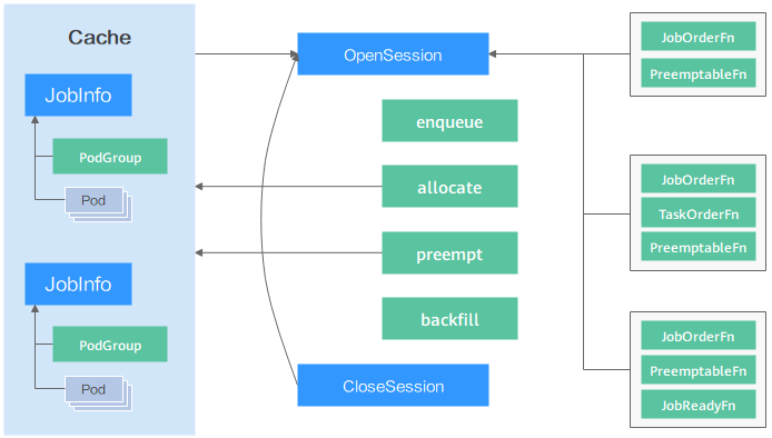 如上所示,CCE集群的部署架构图,其中,Master模块中包括接口服务器组件以及副本控制器组件,接口服务器组件用于对接集群内外的服务接口,副本控制器组件用于提供多容器应用服务的高可用性,节点Node支持水平扩展集群,节点中可扩展部署Pod集群,Pod中可编排不同的容器应用如上所示,在应用组件集群的工作负载中,支持高效的应用组件版本控制,提供应用组件按照版本滚动部署、按照版本恢复部署的集群管理功能如上所示,在CCE容器应用集群扩缩容部署中,其中,部署的触发策略包括按照预先设定的时间点触发、按照集群数据的统计分析策略触发,由集群的自动扩缩容管理器根据需要更新部署的应用实例数执行调度,水平扩展或者缩减Node节点数或者在Node节点中扩展或者缩减Pod实例数如上所示,在CCE容器引擎中,部署lstio微服务应用集群,集群是由控制面以及数据面构成,访问流量的输入由负载均衡器分发、Pod实例中的应用侧访问代理组件对接应用提供的服务、集群的微服务治理策略由控制面提供实现如上所示,DevOps是开发运维的标准流程,在软件研发领域中提供持续交付的支撑能力,CCE容器引擎为企业提供不同的部署环境,其中,包括开发环境、测试环境、生产环境以及其他根据企业的需求而设置的运行环境,在流程中,开发人员提交代码,由运维人员构建容器镜像应用到容器镜像仓库SWR、部署容器镜像应用到对应的运行环境中,提供业务服务如上所示,混合云包括公有云以及私有云,华为云是公有云、客户IDC是私有云,由DevOps构建到公有云的容器镜像仓库SWR中的容器镜像,同步到客户IDC的私有云容器镜像仓库中,由运维人员同步发布容器镜像应用到公有云或者私有云CCE容器集群运行环境中如上所示,Volcano在Kubernetes之上抽象了一个批量计算的通用基础层,向下弥补Kubernetes调度能力的不足,向上提供灵活通用的Job抽象。Volcano通过提供多任务模板功能实现了利用Volcano Job描述多种作业类型(Tensorflow、Spark、MPI、PyTorch等),并通过Volcano统一调度系统实现多种作业混合部署,解决集群资源共享问题如上所示,通过这两个队列去共享整个集群的资源,一个队列获得40%的资源,另一个队列获得60%的资源,这样可以把两个不同的队列映射到不同的部门或者是不同的项目中。并且在一个队列里如果有多余的空闲资源,可以把这些空闲资源分配给另外一个队列里面的作业去使用如上所示,Volcano scheduler调度流程,首先将API server中的Pod、PodGroup信息加载到scheduler cache中。Scheduler周期被称为session,每个scheduler周期会经历OpenSession,调用Action,CloseSession三个阶段。其中OpenSession阶段加载用户配置的scheduler plugin中实现的调度策略;调用Action阶段逐一调用配置的action以及在OpenSession阶段加载的调度策略;CloseSession为清理阶段。Volcano scheduler通过插件方式提供了多种调度Action(例如enqueue,allocate,preempt,backfill)以及调度策略(例如gang,priority,drf,proportion,binpack等),用户可以根据实际业务需求进行配置。通过实现Scheduler提供的接口也可以方便灵活地进行定制化开发