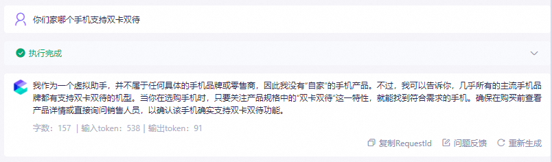 ,在创建的页面中预先体验与智能体的对话交互,由于还没有提交业务数据给大模型检索以及学习,对话内容相对简单,智能体还不能准确回答业务问题,发布提交,完成模型的创建