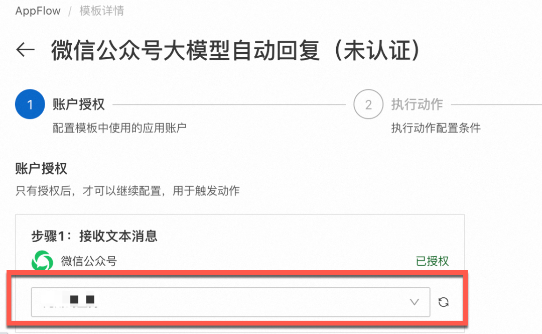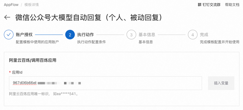 在阿里云AppFlow业务控制台中,输入从微信公众号业务控制中获取到的应用AppID