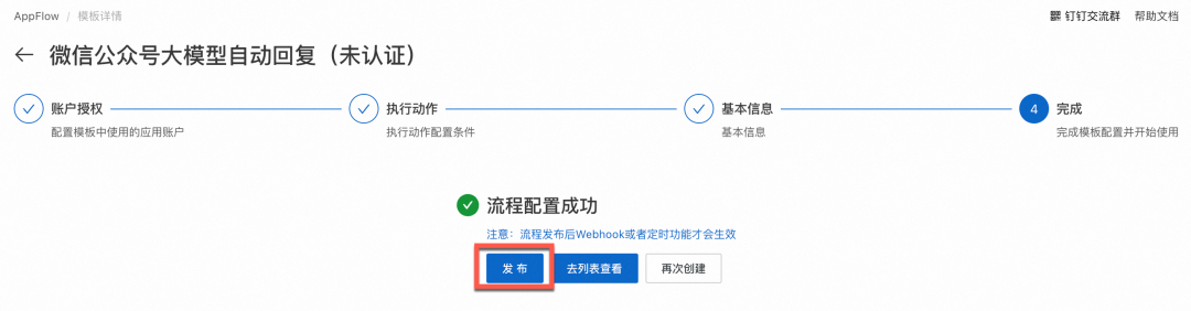 在阿里云AppFlow业务控制台中,提交发布对接微信公众号的AppFlow应用流