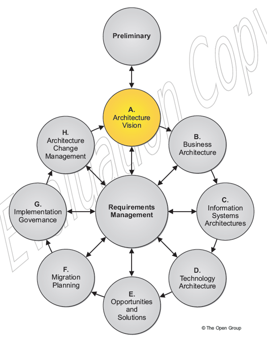 如上所示,架构愿景(Architecture Vision)在TOGAF标准规范中处于A阶段