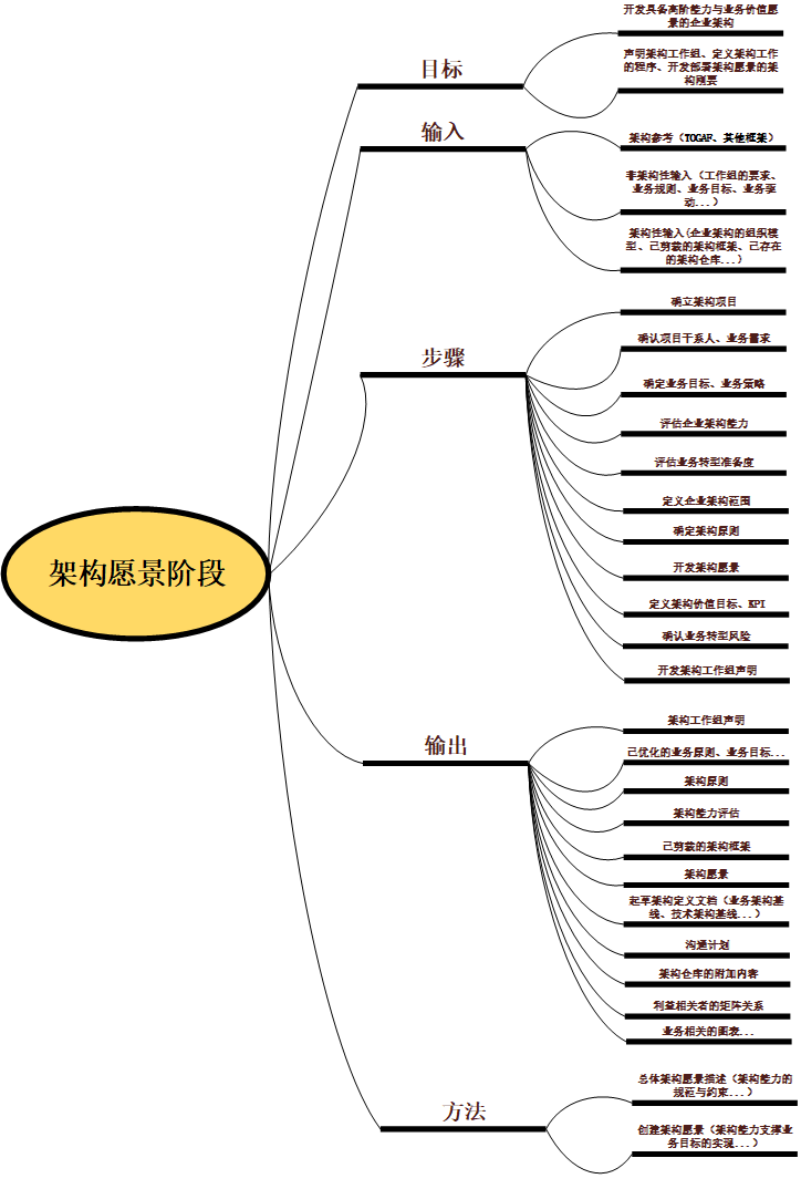 如上所示,架构愿景阶段的标准流程包括确定阶段目标、输入信息资料、执行处理步骤、输出标准信息、采取的流程方法