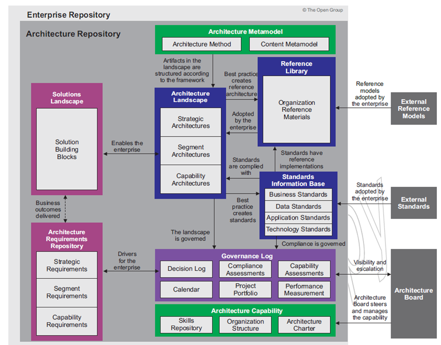 架构仓库的附加内容,架构仓库的组织结构如下图所示,其中,包括架构元模型、解决方案总览、架构总览、参考引用库、架构需求仓库、标准信息库、治理日志、架构能力、外部引用模型、外部标准、架构理事会