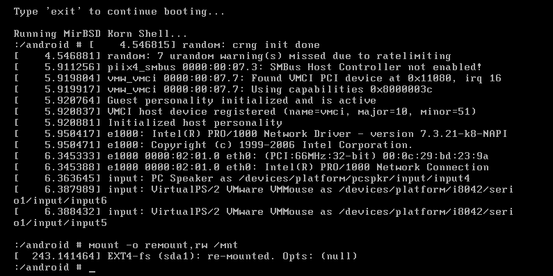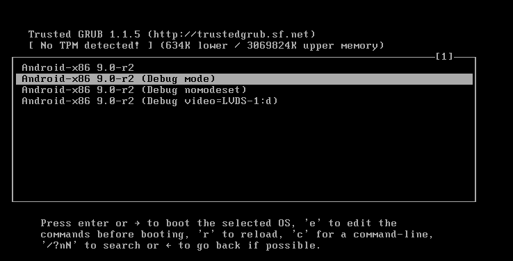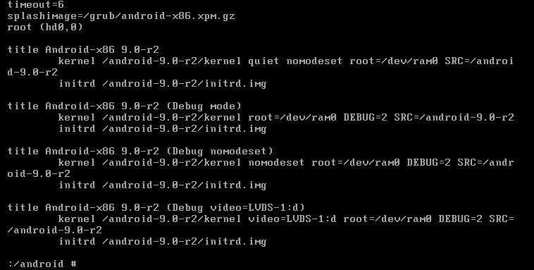 如上所示,在操作系统命令行中输入以上命令,编辑指定文件,增加参数quiet nomodeset,设置Android-x86操作系统启动参数
