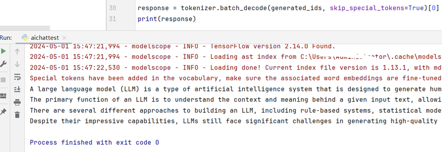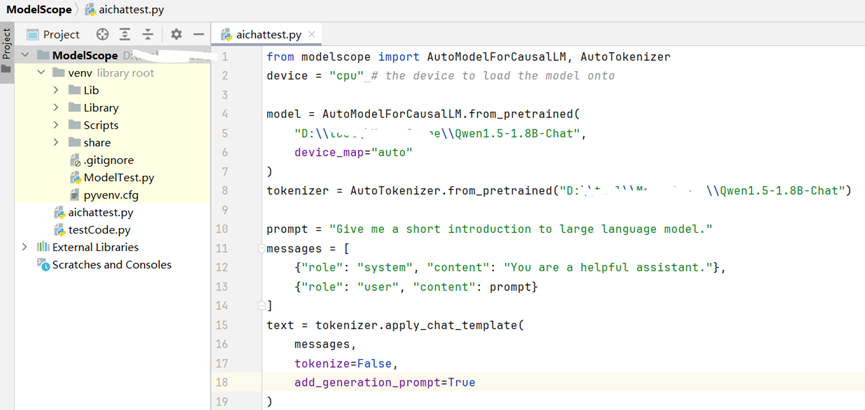 如上所示,在JetBrains PyCharm的项目工程的测试代码中,加载开源的千问大模型,设置本地开发环境使用CPU设备