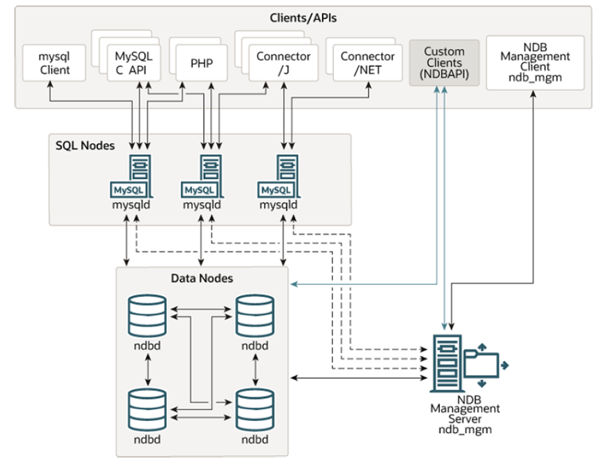如上所示,NDB Management Server是数据库集群的管理节点、负责管理数据库集群,Data Nodes是数据存储节点、负责数据存取,SQL Nodes是支持事务的MySQL Server实例节点、负责数据处理,数据存储节点的数量以及数据处理节点的数量可以根据实际的存储容量以及性能需求不断扩展