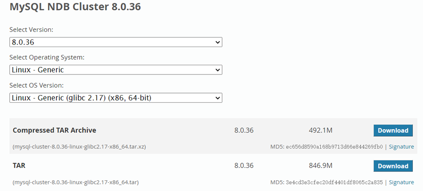 如上所示,从MySQL官方网站下载最新版本的NDB集群安装文件,该版本对应Linux CentOS 7的glibc 2.17版本