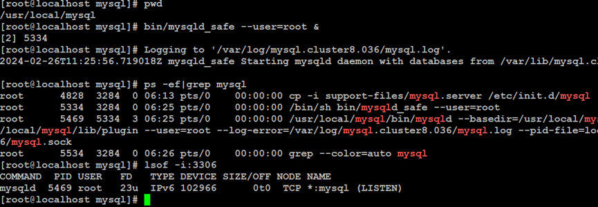 如上所示,使用root用户启动MySQL Cluster 8.036版本成功