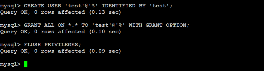 如上所示,创建远程访问用户test成功、授权访问权限成功