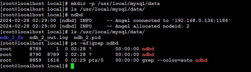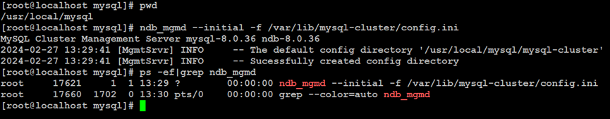 如上所示,在集群管理节点上启动ndb_mgmd服务