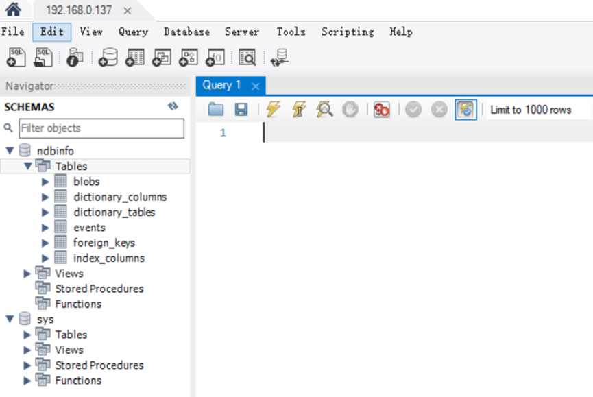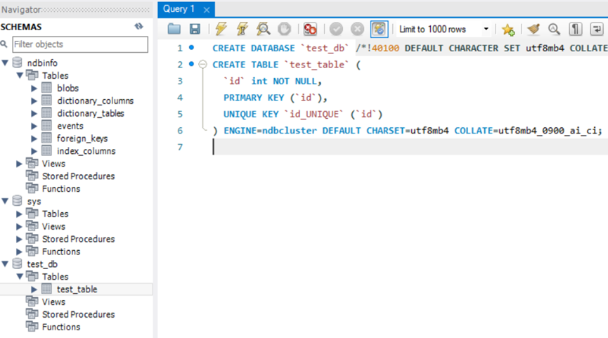 如上所示,使用Workbench创建test_db数据库成功、创建test_table数据表成功(存储引擎类型使用ndbcluster)