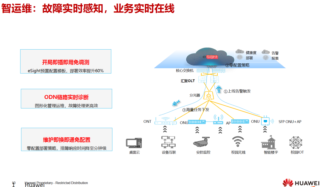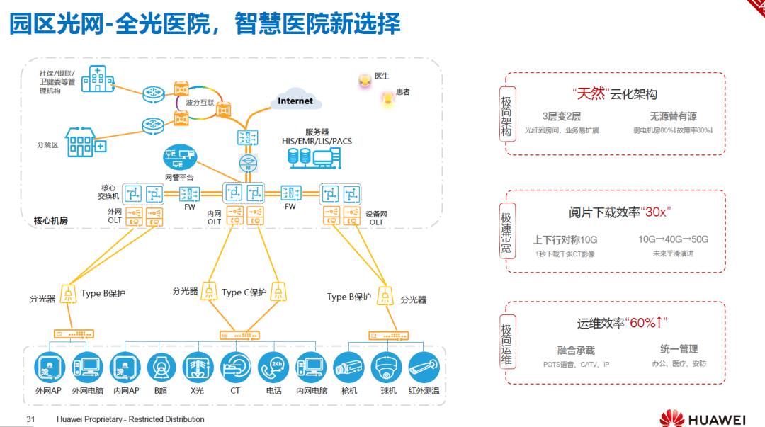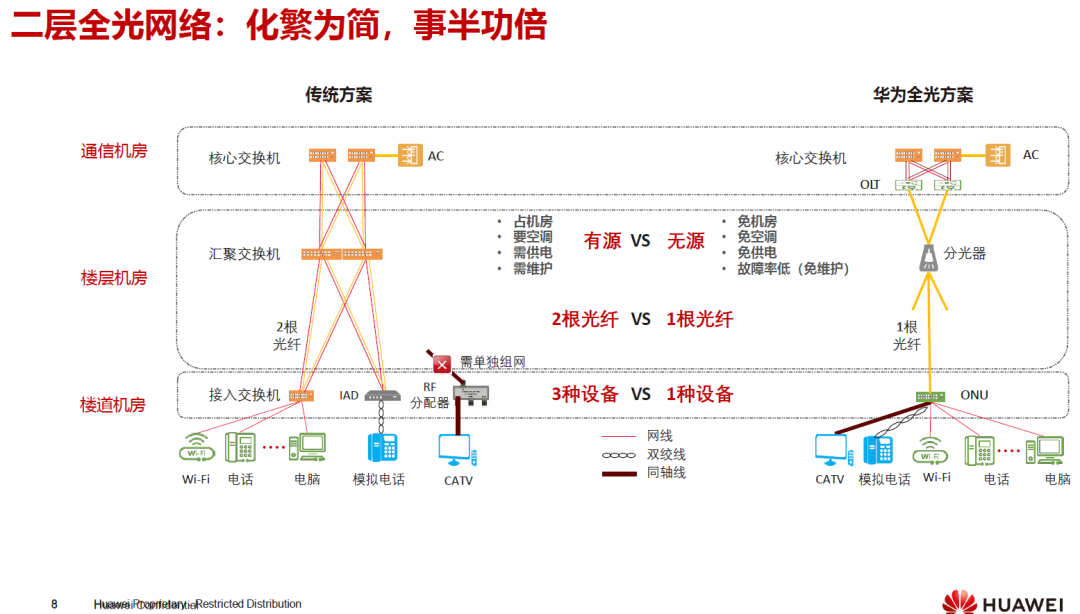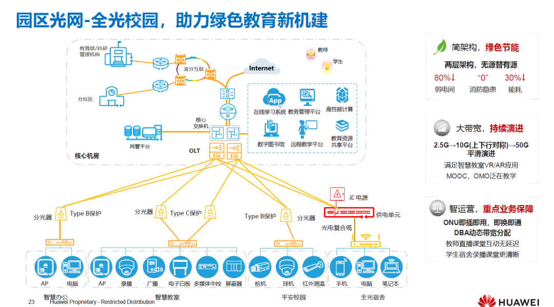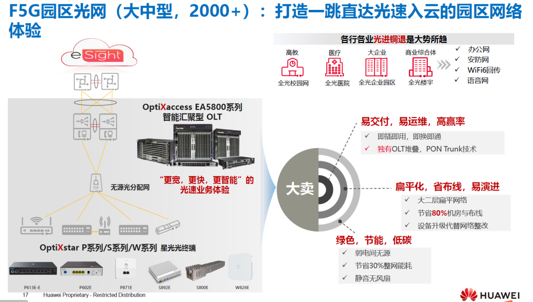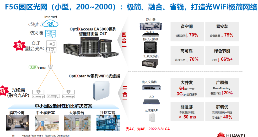 随着全球碳中和实践发展,光进铜退是必然发展趋势,园区网络全光化已经成为新一代智慧园区的新名片。相较传统网络方案,全光园区采用光纤下沉,将光纤从弱电机房延伸到每个房间,每个桌面,每个机器,实现一张光网络承载园区所有应用,在带宽、部署范围、运维成本、使用周期上具有显著的优势,高度契合园区应用云化、物联网、超清视频等业务发展诉求,帮助行业客户打造绿色、极简的智慧园区网络,获得了教育、医疗、酒店等行业客户的一致认可,目前应用到了全球50多个国家6000多个客户。