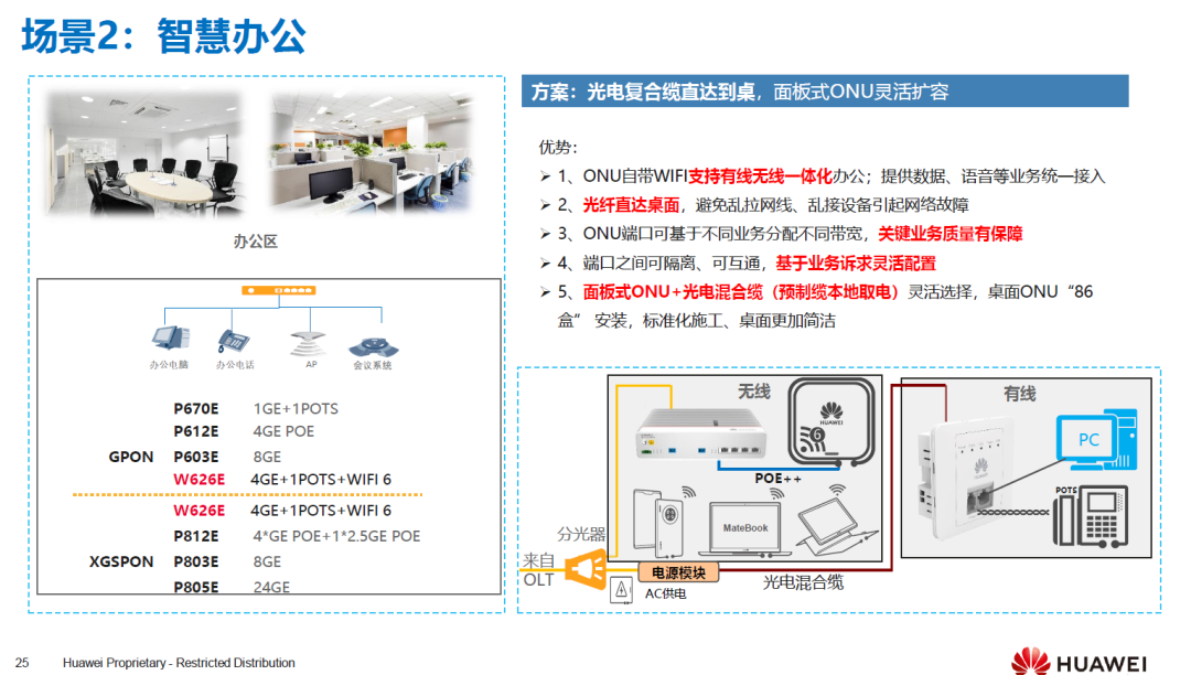 华为全光园区(Huawei FTTO)通过将F5G光技术运用到企业园区,实现了园区网络传输介质演进、架构创新及运维革命,为行业客户打造超高带宽、绿色节能的智慧园区网络。