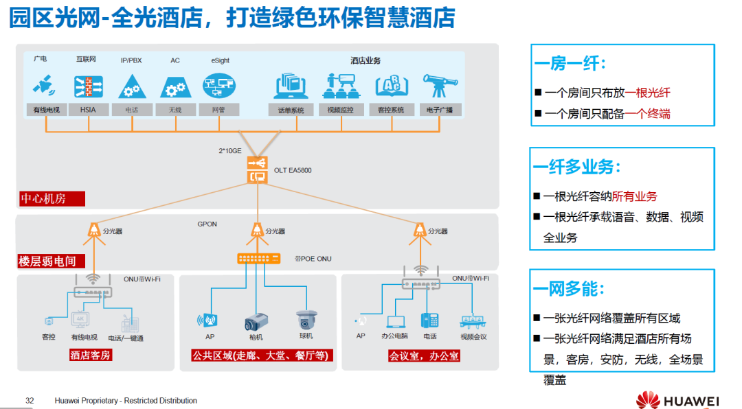 华为商业地产园区光网络解决方案是基于POL(Passive Optical LAN,无源光局域网)技术的园区网络解决方案,通过一张光纤网络为商铺、会议/办公、楼控/安防和酒店等场景提供绿色智简网络保障。方案具备简架构,绿色节能、大带宽、持续演进、智运维的特点,为商业地产降本增效、可持续发展保驾护航。