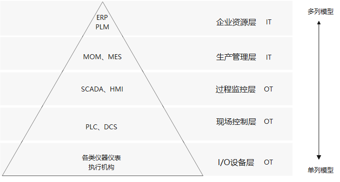 工业控制系统基于国际标准 IEC 62264-1,采用五层架构模型,用于描述工业自动化系统的功能分层。从底层设备通道 IO 采集,到 MES 系统的多列模型,再到 ERP 系统的多列表格展示,数据组织需求随着层级上升而发生变化。