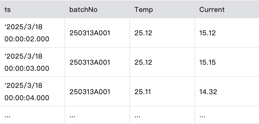//支持创建时以别名方式,将底层采集数据与上位应用结构相互解耦create vtable d1(ts timestamp,batchNo varchar(64)from batchNo.val,Temp float from Temp.val,Current float from Current.val)