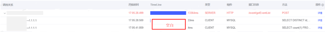 但这四个方法在Vtrace系统中的Trace信息中什么都体现不了,JavaAgent并没有采集到相关信息。这恰好说明了这里存在监控盲区,并且盲区远比想象中的要大,某些场景中连最基本的MySQL执行的信息都看不到。